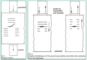 The method of transmission is also called penetration or shading. The method utilizes the masking effect of the material interface (material discontinuity) . The method uses two opposite ultrasonic probes, one as transmitter and one as receiver. The homogeneity and defects of materials are evaluated by detecting the propagation of ultrasonic waves in materials, including transmission, absorption and scattering. The“Mirror-shadow method”, in which the probe is located on the side of the test sample, can also be used (Fig. 2).